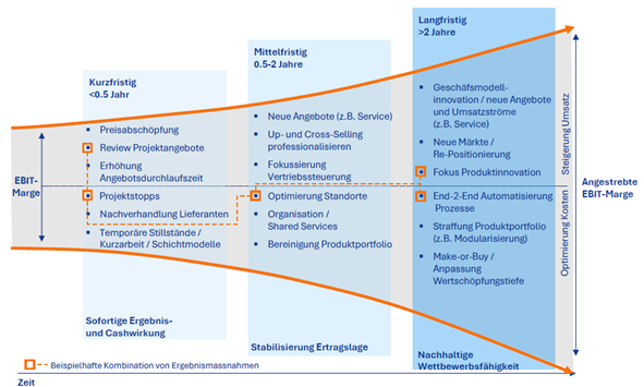Die Hebel, um in exportorientierten Unternehmen die Abhängigkeit von Handelshemmnissen und dem starken Schweizer Franken zu reduzieren, sind bewährt. Es gilt, die richtige Kombination an Instrumenten und Massnahmen zu finden, um die Wettbewerbsposition und Ertragskraft langfristig zu sichern. Kurz-, mittel- und langfristige Massnahmen sind punkto Investitionen, internen und externen Ressourceneinsatz und gegenseitige Abhängigkeiten abzustimmen und in einem Transformationsprogramm zu kombinieren. Kurzfristig ist die zeitnahe Ergebnis- und Cashwirkung entscheidend, während mittel- und langfristig die Ertragslage und nachhaltige Wettbewerbsfähigkeit gestärkt wird.